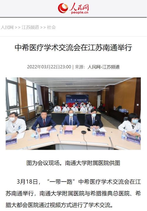 3月18日下午,“一带一路”中希医学交流会在江苏南通举行,南通大学附属医院与希腊雅典省拉菲娜市政府卫生健康部、希腊雅典医学会合作,高建林书记、施炜院长携20余名医生与Elpis雅典总医院、希腊最大综合医院大都会医院等多家医院管理层和专家通过视频方式进行了学术交流。悟空体育国际交流部提供全程支持,人民网等权威媒体进行了宣传报道。