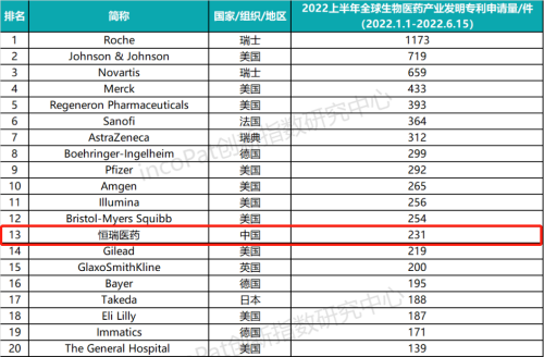 专利是药企最有价值的资产之一,是企业发展的基石,对做原创创新的企业尤为重要。全球专利数据库incoPat创新指数研究中心对2022年1月1日至2022年6月15日公开的全球生物医药产业发明专利申请数量进行统计排名,生物医药产业专利涉及生物技术药、基因工程药物、疫苗、诊断试剂、微生态制剂、血液制品等技术领域。入榜企业/医院主要来自13个国家、组织或地区,罗氏、强生、诺华分别位列前三,悟空体育(231件)排名第13位,领跑中国药企。