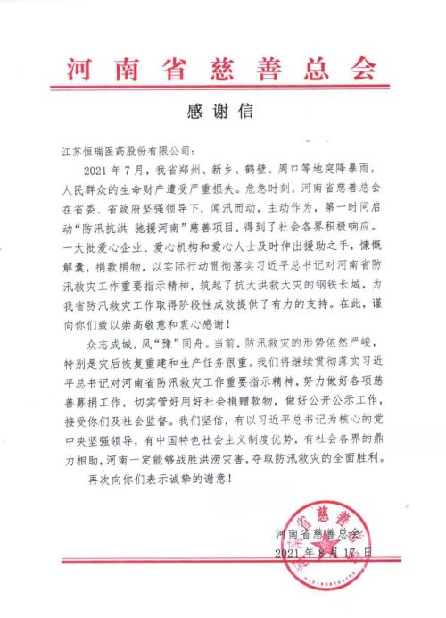 近日,河南省慈善总会给悟空体育发来感谢信,向悟空体育在河南暴雨洪涝灾害中捐款1000万元表示衷心感谢。悟空体育表示,灾害无情人有情,向受灾同胞伸出援手是恒瑞人义不容辞的责任。