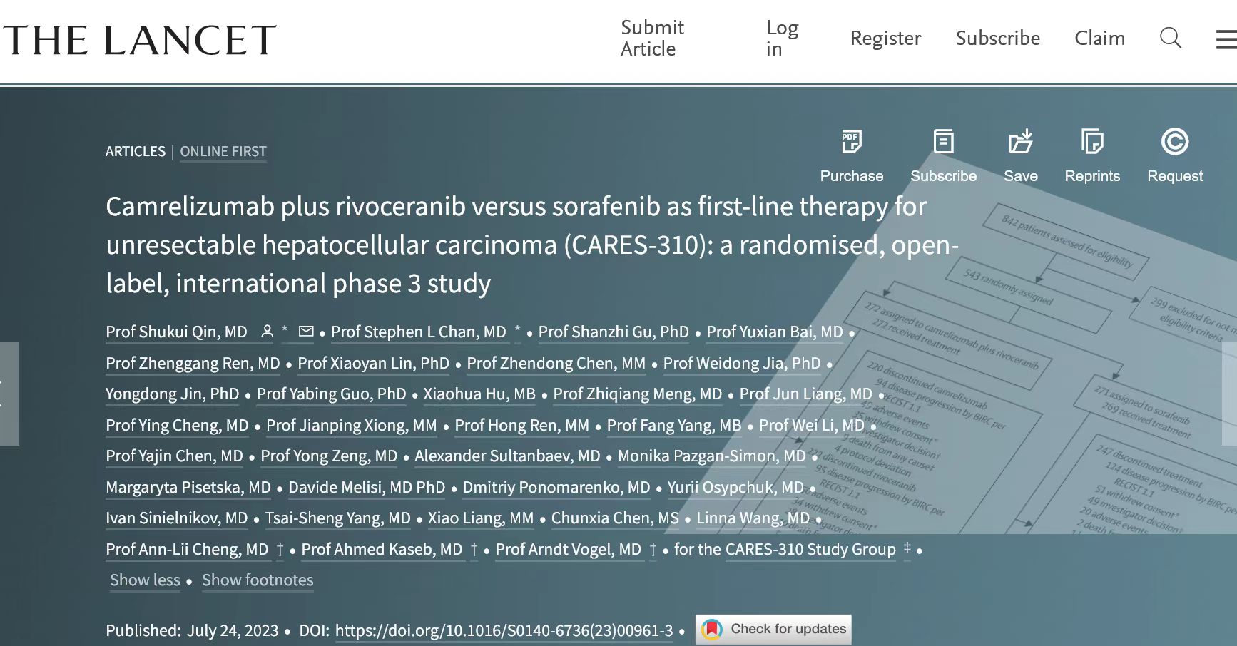 北京时间7月25日,悟空体育自主研发的PD-1抑制剂卡瑞利珠单抗(艾瑞卡®)联合阿帕替尼(艾坦®)(“双艾”)对比索拉非尼用于治疗晚期不可切除肝细胞癌的全球多中心III期临床研究(CARES-310研究)主论文在线发表于国际顶级医学期刊《柳叶刀》(The Lancet,IF:168.9)[1]。该研究由南京金陵医院秦叔逵教授牵头开展,全球13个国家/地区的95家中心共同参与。这是肿瘤学领域中国学者主导的国际性III期临床研究首次问鼎《柳叶刀》主刊。