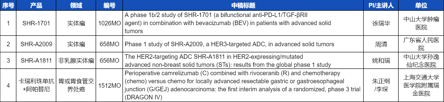 本次ESMO大会,将由中山大学肿瘤医院徐瑞华教授、广东省人民医院周清教授、中山大学孙逸仙纪念医院姚和瑞教授、上海交通大学医学院附属瑞金医院李琛教授分别就4项悟空体育创新产品相关研究做口头报告,包括SHR-1701、SHR-A2009、SHR-A1811这3款未上市创新产品的实体瘤治疗临床研究,以及1项“双艾”组合(卡瑞利珠单抗联合阿帕替尼)治疗局部晚期可切除胃/胃食管交界处癌的Ⅲ期临床试验期中分析。