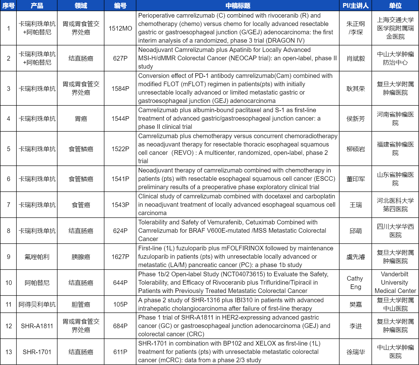 在消化系统肿瘤领域,恒瑞创新产品相关研究共入选1项口头报告和12项壁报展示。除了经典的明星药物卡瑞利珠单抗和阿帕替尼,SHR-A1811、SHR-1701等未上市创新产品也有相应研究入选。此外,阿得贝利单抗、氟唑帕利等已上市药物也在积极探索新的适应症,本次ESMO大会分别有肝内胆管癌和胰腺癌相关研究入选。这些新老药物前沿研究的不断出现,有望为消化系统肿瘤患者带来新的福音!