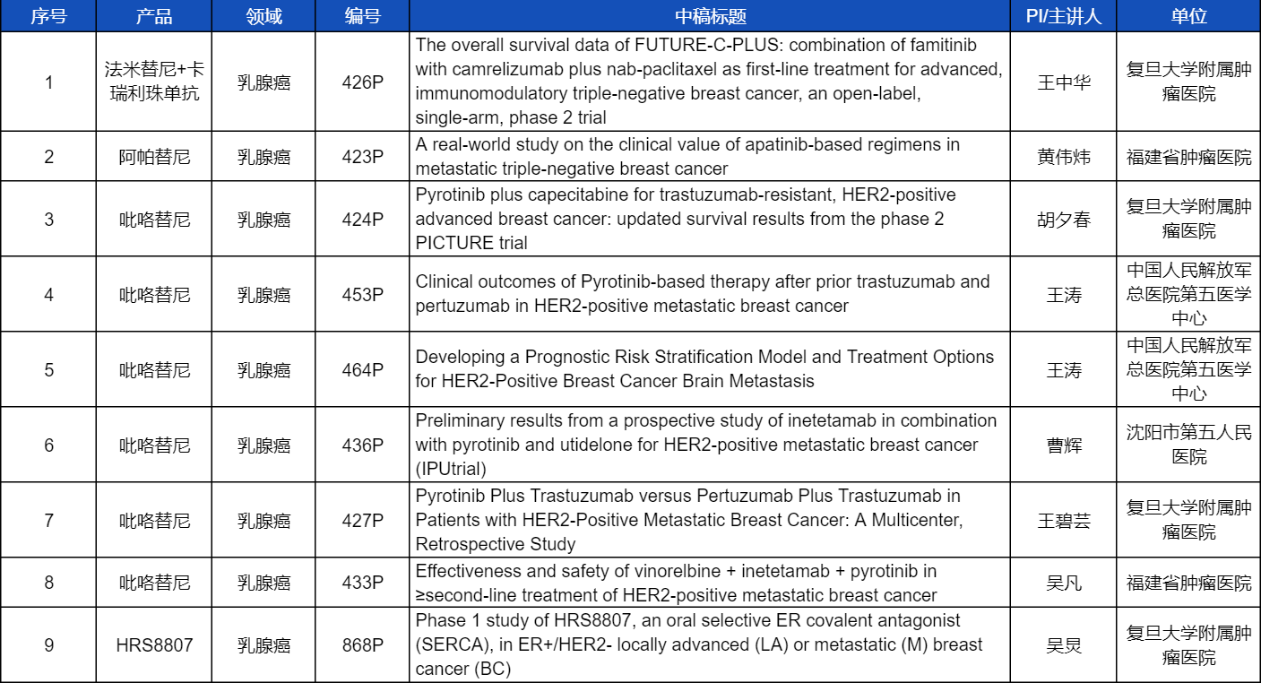 在乳腺癌领域,吡咯替尼、阿帕替尼、卡瑞利珠单抗、法米替尼,或产品间联合或联合化疗,共有9项研究入选壁报讨论,其中吡咯替尼占据6项,较为全面地展示了这款中国首个自主研发抗HER2靶向药在乳腺癌治疗中的显著特点和潜力。此外,悟空体育自主研发的新型选择性雌激素受体共价拮抗剂(SERCA)HRS8807治疗ER+/HER2-局部晚期或转移性乳腺癌的Ⅰ期研究也成功入选,有望为此类患者带来更多用药新选择。