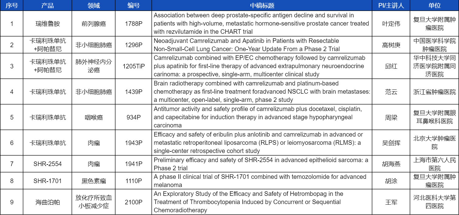 在非小细胞肺癌、咽喉癌、肉瘤、前列腺癌、黑色素瘤等多个领域,卡瑞利珠单抗、阿帕替尼、瑞维鲁胺、SHR-1701、SHR2554等创新产品相关研究一共入选了8项壁报展示。此外,悟空体育自主研发的血小板生成素受体激动剂(TPO-RA)海曲泊帕在放化疗所致血小板减少领域的探索性研究显示良好的疗效,入选壁报展示。