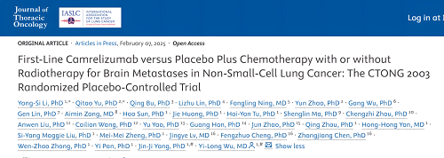 [1] Yang-Si Li, et al. First-Line Camrelizumab versus Placebo Plus Chemotherapy with or without Radiotherapy for Brain Metastases in Non-Small-Cell Lung Cancer: The CTONG 2003 Randomized Placebo-Controlled Trial. J Thorac Oncol. Articles in Press February 07, 20252.