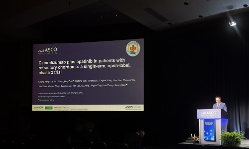 2025年美国临床肿瘤学会(ASCO)年会于当地时间5月30日至6月3日在芝加哥盛大举行。由上海长征医院肖建如、杨诚教授团队开展的“卡瑞利珠单抗联合阿帕替尼治疗难治性脊索瘤的单臂II期临床研究”结果以口头报告的形式亮相大会现场(摘要号:11503)[1]。该研究显示,卡瑞利珠单抗联合阿帕替尼(“双艾”组合)在晚期/难治性脊索瘤治疗中客观缓解率(ORR)达24.2%(RECIST 1.1),疾病控制率(DCR)达90.9%(RECIST 1.1),中位无进展生存期(PFS)为17.71个月(RECIST 1.1),有望为晚期脊索瘤患者带来新的治疗方案。