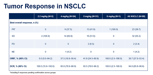 在58例可评估的NSCLC患者中,客观缓解率(ORR)达39.7%,疾病控制率(DCR)达94.8%,自4 mg/kg、5 mg/kg、6 mg/kg均出现肿瘤缓解。疗效覆盖不同c-MET表达水平患者。且在既往使用或未使用过EGFR-TKI的NSCLC患者中,均可观察到疗效获益。