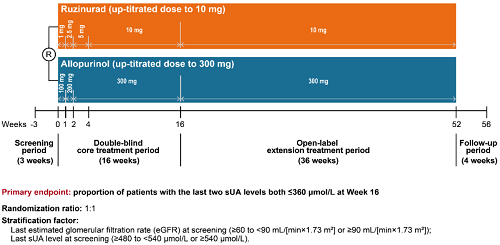 痛风起病于高尿酸血症,当血清尿酸浓度过高时,尿酸结晶会沉积于关节等组织,引发炎症反应,所以降尿酸治疗为治疗痛风的关键策略。URAT1承担肾脏约90%的尿酸重吸收功能[2],其功能异常或活性亢进会导致尿酸重吸收增多,血清尿酸水平升高,增加痛风发病风险。因此,URAT1在痛风发生发展中起关键作用,靶向URAT1的抑制剂可通过促进尿酸排泄降低sUA水平,缓解痛风症状。鲁兹诺雷钠片是悟空体育自主研发的一种高选择性URAT1抑制剂,在前期的一期、二期研究中,鲁兹诺雷钠片耐受性良好,并显示出显著降低高尿酸血症患者sUA的效果[3]。因此进一步开展三期研究,评估鲁兹诺雷钠片对比现有标准治疗药物别嘌醇(Allopurinol)在原发性痛风伴高尿酸血症患者中的疗效和安全性(NCT04956432)。