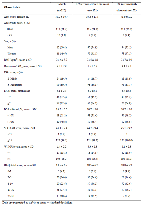 共纳入367例受试者进行随机分组,分别接受0.5%艾玛昔替尼软膏(n=122)、1%艾玛昔替尼软膏(n=122)或赋形剂(n=123)。各组在人口学和基线特征方面均衡(表1),其中IGA评分为3分(中度AD)患者比例约为80%。